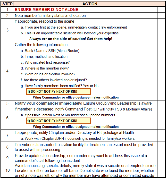Remember, every potential contingency which may come from a suicide or suicide attempt is different. Use your judgment.